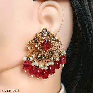 Handcrafted 22k gold plated earrings studded with garnet, Sheesh and pearls.