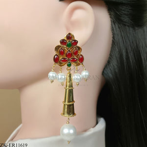 Handcrafted 22k gold plated earrings adorned with ruby, emerald and pearls.