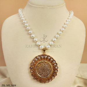 andcrafted 22k gold plated calligraphy mala adorned with champagne and pearls.