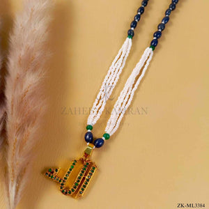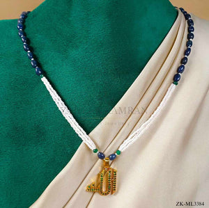 Handcrafted 22k gold plated mala studded with sapphire, emerald and pearls.