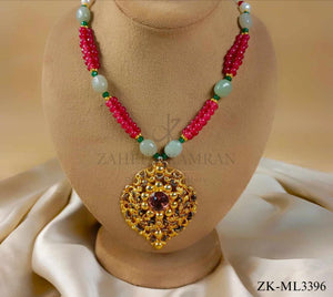 Handcrafted 22k gold plated mala studded with ruby, emerald and pearls.