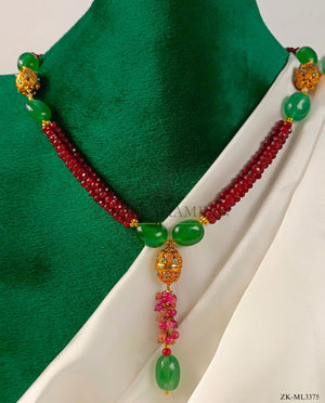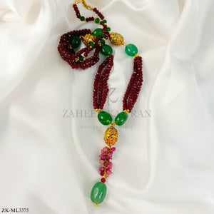 Handcrafted 22k gold plated mala studded with garnet, emerald and ruby.