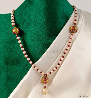 Handcrafted 22k gold plated mala studded with garnet, emerald and pearls.