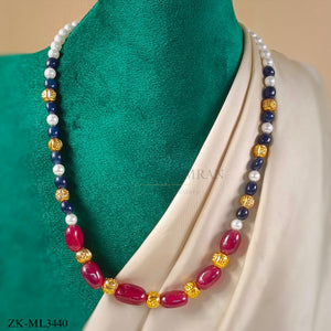 Handcrafted 22k gold plated mala studded with garnet, sapphire and pearls.