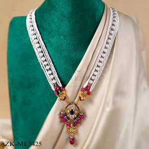 Handcrafted 22k gold plated mala studded with ruby, amethyst, emerald and pearls.