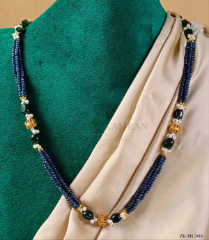 Handcrafted 22k gold plated mala studded with sapphire, emerald and pearls.