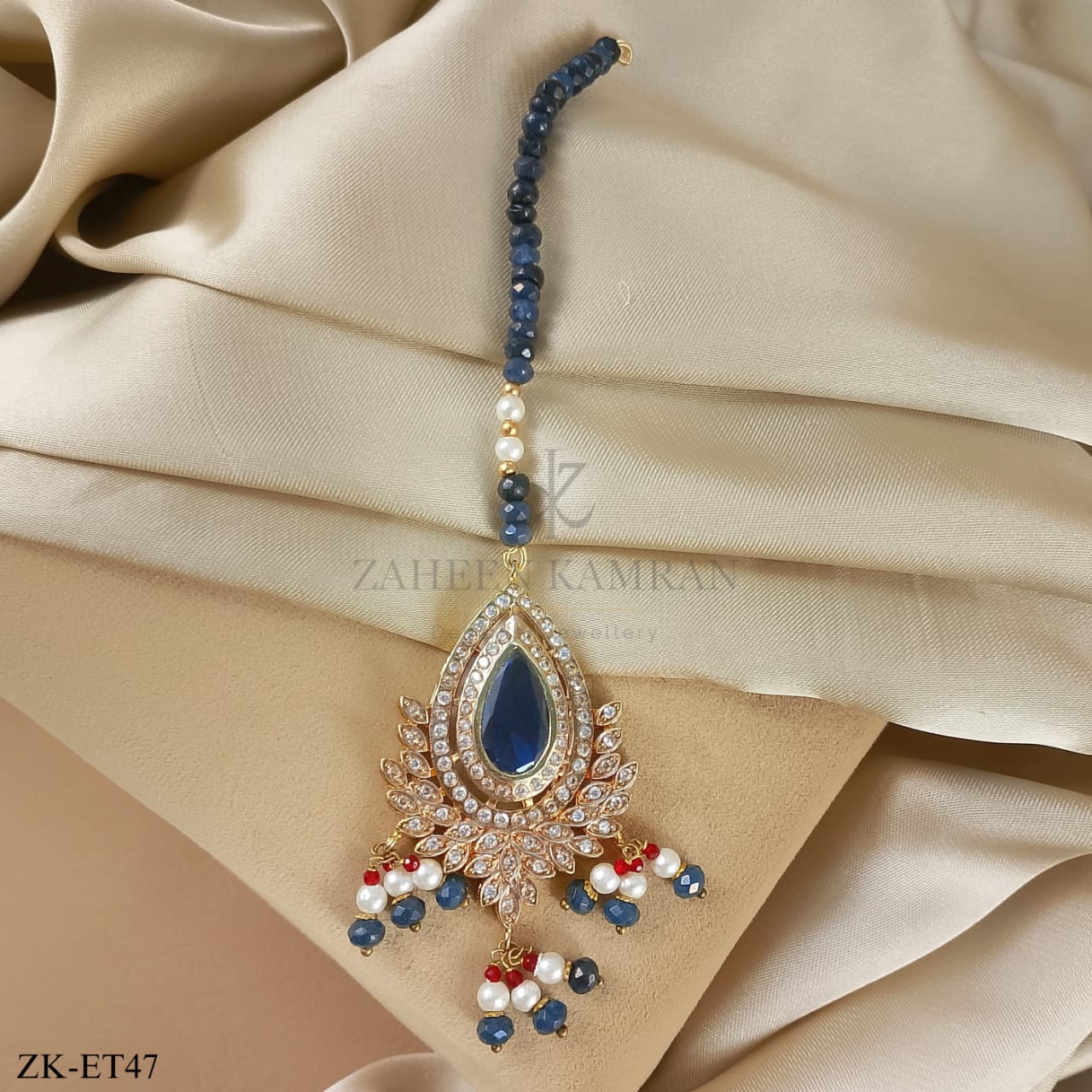 Handcrafted 22k gold plated earrings studded with sapphire, zircons and pearls.