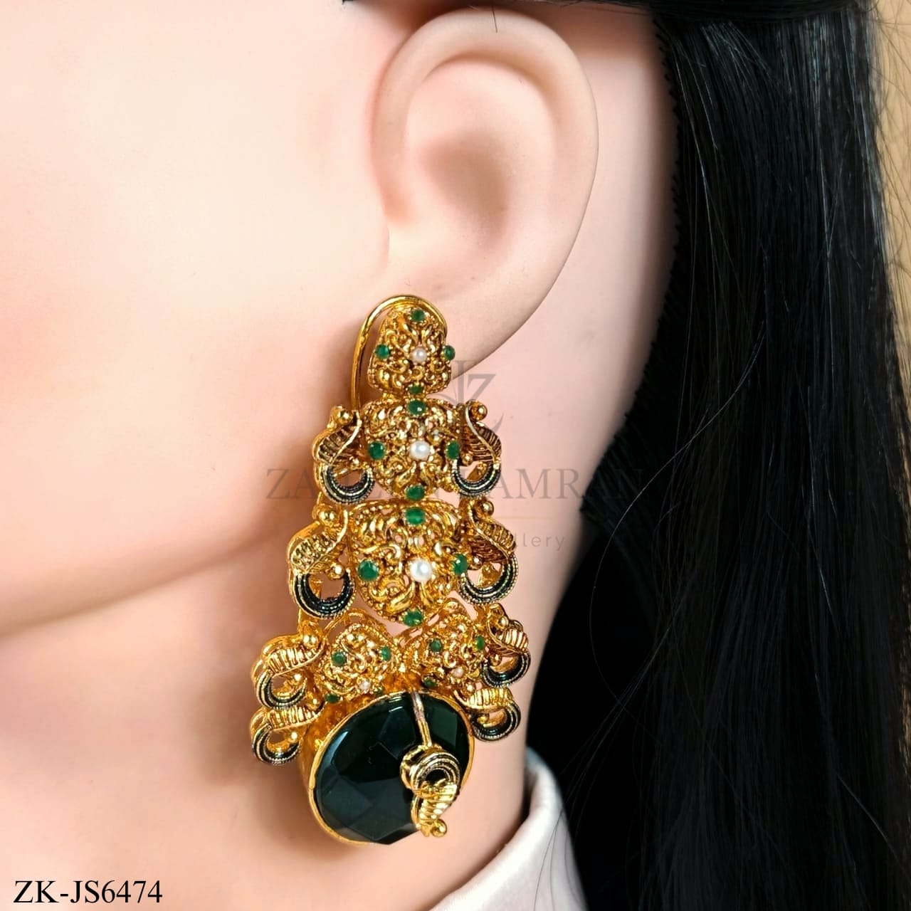 Handcrafted 22k gold plated necklace alongside earrings studded with emerald and pearls.