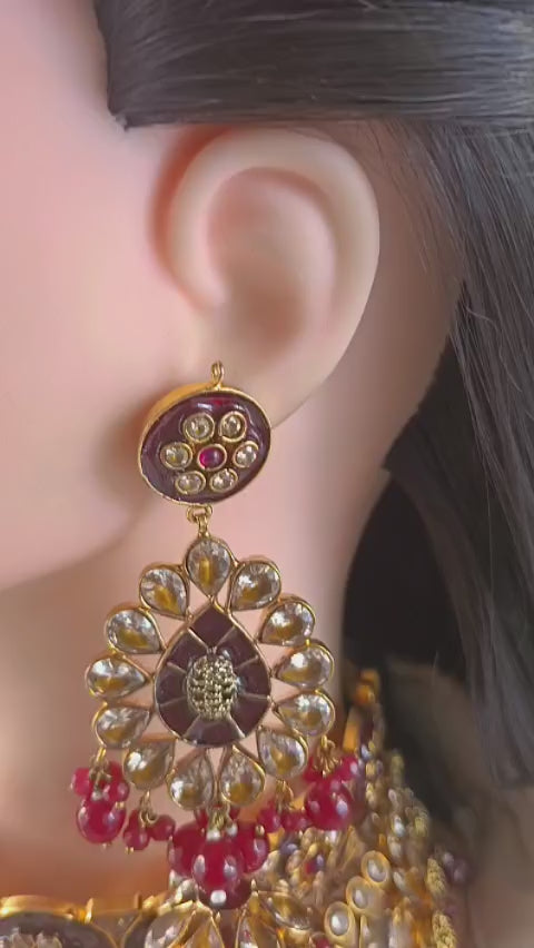 Handcrafted 22k gold plated necklace alongside earrings and tikka adorned with ruby, champagne and brown Meena.