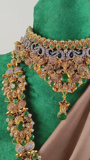 Handcrafted 22k gold plated mala, necklace alongside earrings, tikka and jhummar adorned with emerald, smoky stones and pearls.