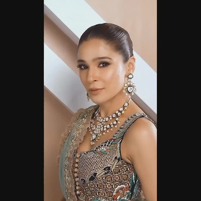 Handcrafted 22k gold plated necklace along with earrings adorned with sheesh, emeralds and green meena.