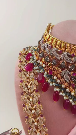 Handcrafted 22k gold plated necklace, mala alongside earrings, tikka and jhummar studded with ruby, sapphire, zircons and pearls.