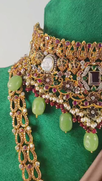 Handcrafted 22k gold plated necklace, mala alongside earrings, tikka and jhummar adorned with garnet, peridot stones and zircons.