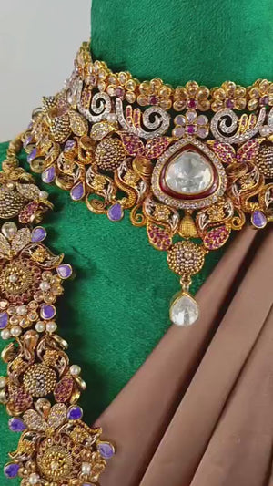 Handcrafted 22k gold plated mala, necklace alongside earrings, tikka and jhummar adorned with amethyst, ruby, sheesh and zircons.