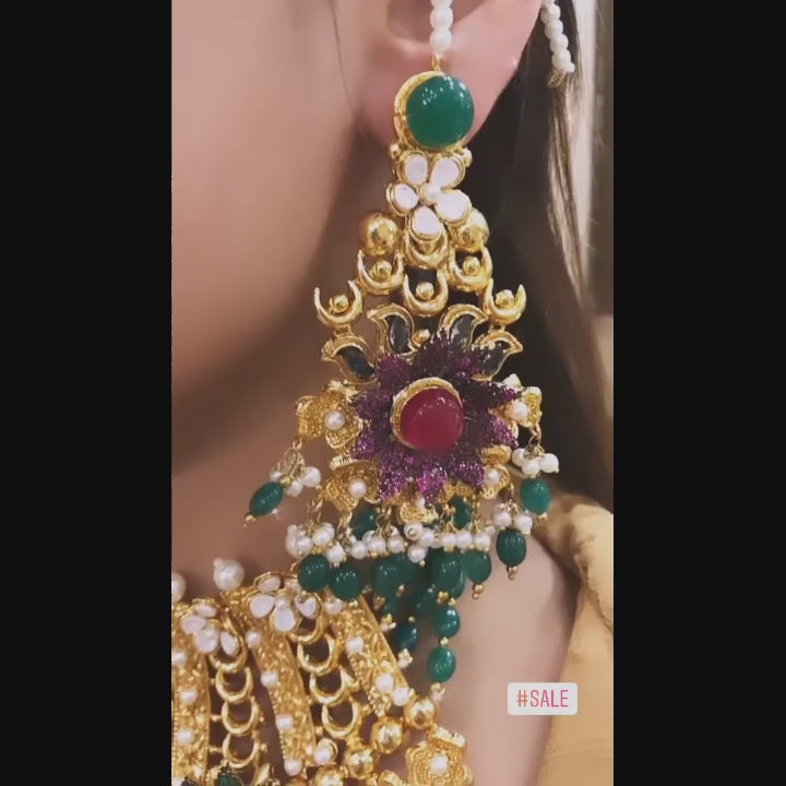 Handcrafted 22 k gold plated heritage necklace with earrings and jhumar studded with rubies emerlds and pearls