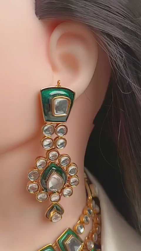 Handcrafted 22k gold plated necklace alongside earrings studded with kundan and green meena