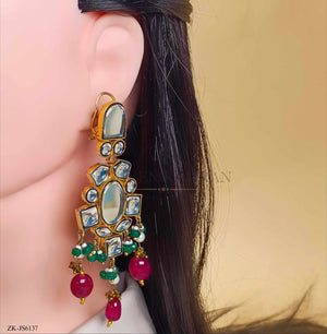 Handcrafted 22k gold plated choker alongside earrings and tikka studded with kundan, ruby and emerald.