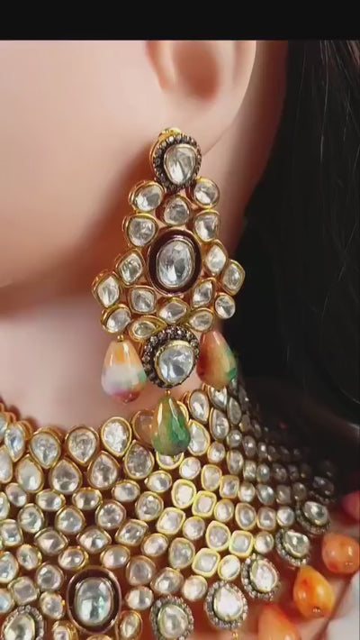 Handcrafted 22k gold plated necklace alongside earrings and tikka studded with kundan and citrine.