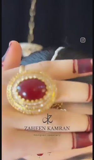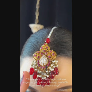 Handcrafted 22k gold plated necklace alongside Mala,earrings and tikka adorned with garnet, ruby, kundan and pearls.