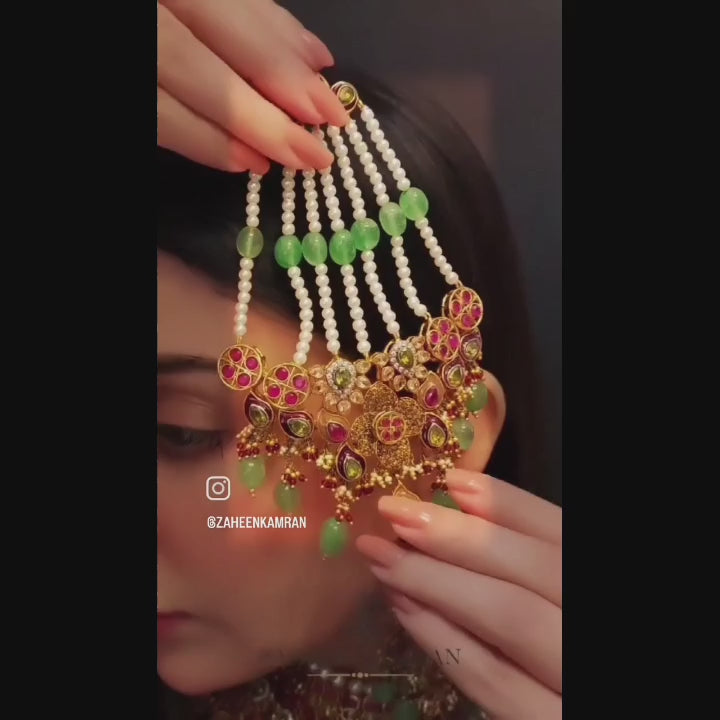Handcrafted 22 k gold plated bridal set with matching earrings, tikka and Jhummar studded with ruby, zircons, champagne and peridot.