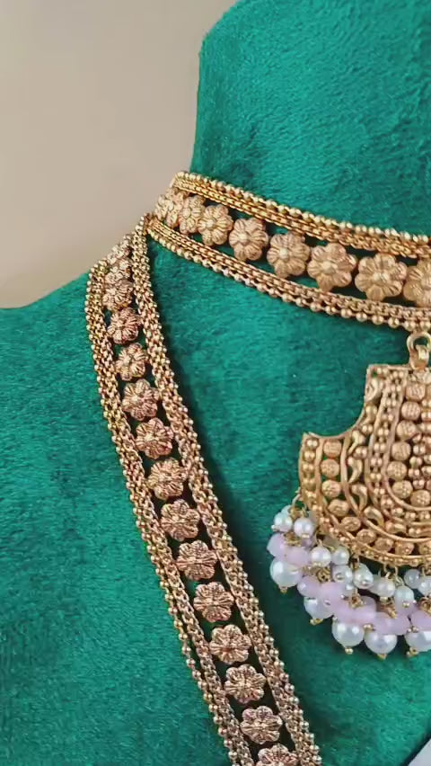 Handcrafted 22k gold plated mala, necklace alongside earrings and tikka adorned with pink stones and pearls.