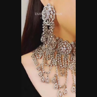 Handcrafted silver plated necklace along with earrings adorned with zircons and sheesh.