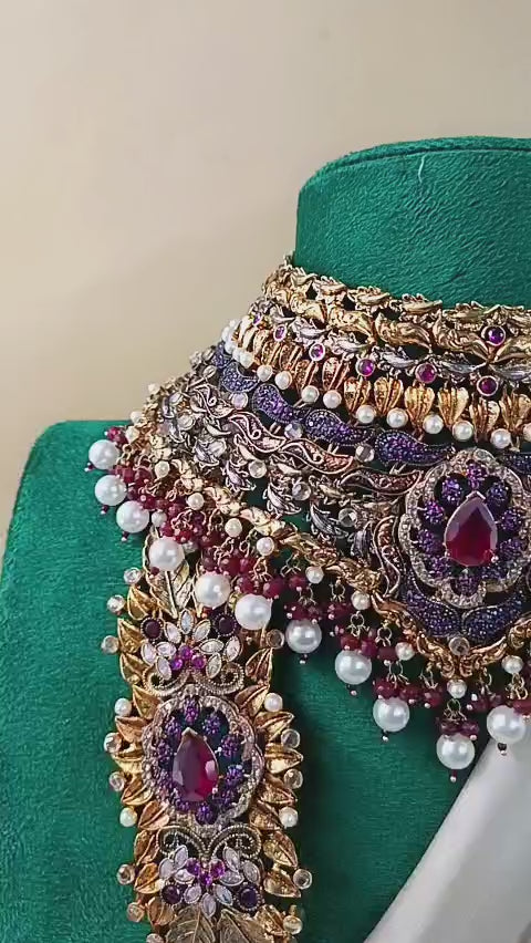 Handcrafted 22k gold plated necklace alongside earrings, tikka and jhummar adorned with ruby, garnet, amethyst and pearls.