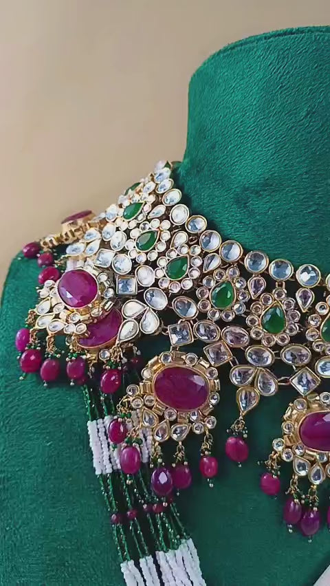 Handcrafted 22k gold plated mala, necklace alongside earrings,tikka and jhummar adorned with kundan, ruby and emerald.