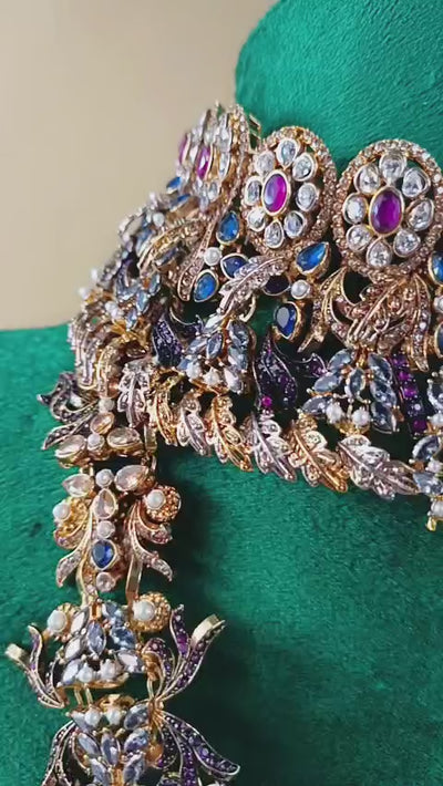 Handcrafted 22k gold plated necklace, mala alongside earrings, tikka and jhummar adorned with ruby, sapphire, champagne and smoky stones.