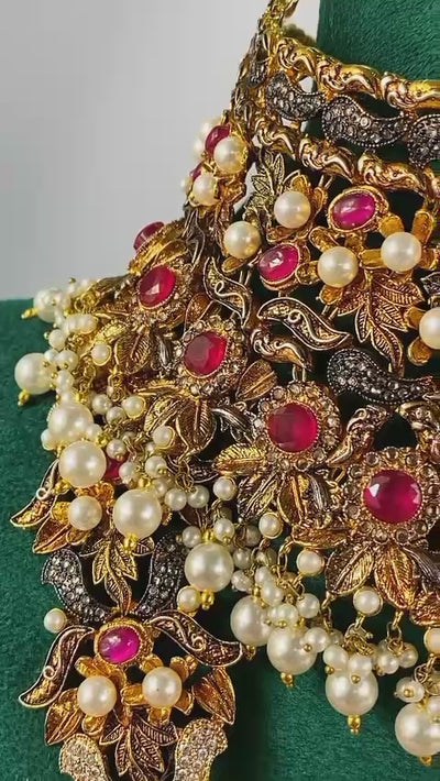 Handcrafted 22k gold plated necklace,mala alongside earrings, tikka and jhummar adorned with  ruby, sheesh and pearls.