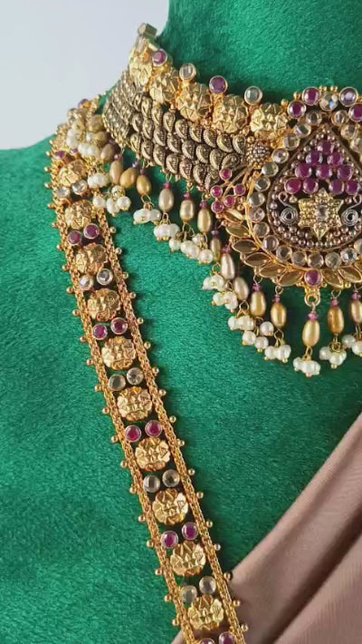 Handcrafted 22k gold plated mala, necklace, earrings, tikka and jhummar studded with ruby and pearls.