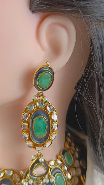 Handcrafted 22k gold plated necklace and earrings, tikka and jhummar adorned with sapphire, kundan, emerald and pearls