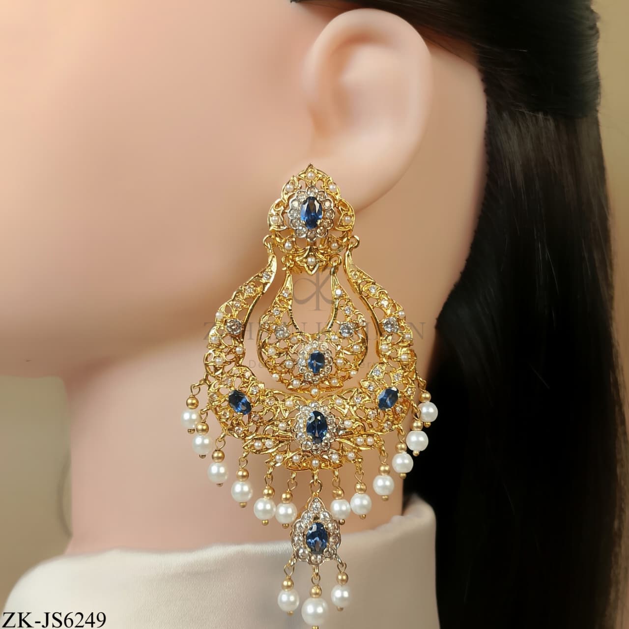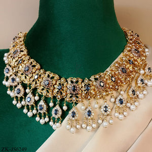 Handcrafted 22k gold plated necklace alongside earrings adorned with sapphire, zircons and pearls.