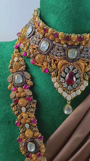 Handcrafted 22k gold plated mala, necklace alongside earrings, tikka and jhummar studded with sheesh, ruby and white opals.