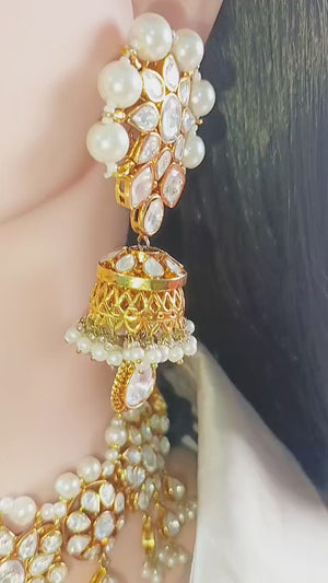 Handcrafted 22k gold plated necklace alongside earrings studded with Sheesh and pearls.