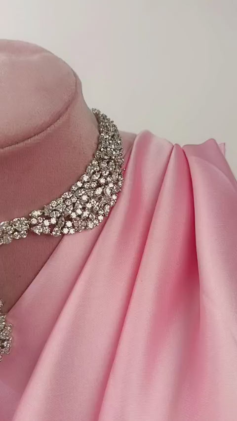 Handcrafted silver plated necklace alongside earrings studded with Sheesh and emerald.