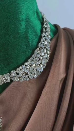 Handcrafted silver plated necklace alongside earrings studded with sheesh and emerald.