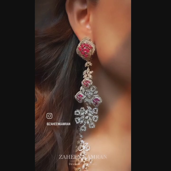 Handcrafted silver plated necklace along with earrings and tikka studded with zircons and ruby.