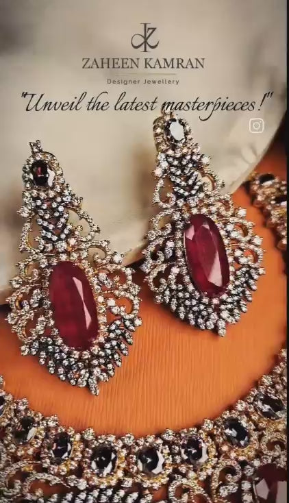 Handcrafted 22k gold plated necklace alongside earrings adorned with garnet, smoky stones and zircons.