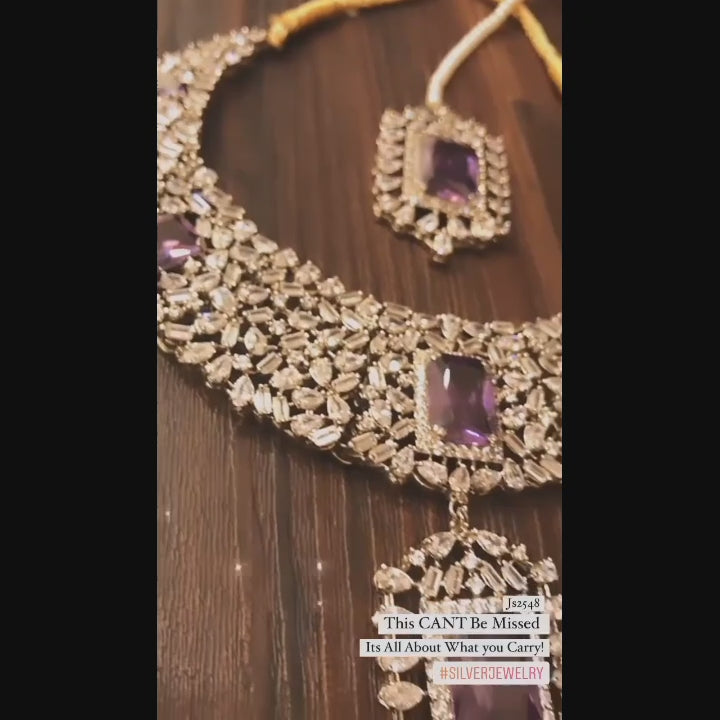 Handcrafted 22 k gold plated necklace with earrings studded with emeralds