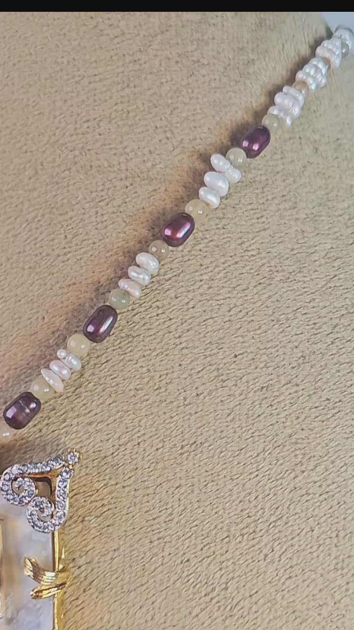 Handcrafted 22k gold plated mala studded with zircons, garnet and pearls.