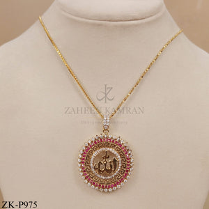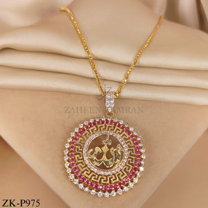 A luxurious gold pendant featuring a central gold calligraphic design surrounded by double rows of zirconia and vibrant ruby.