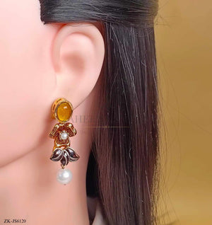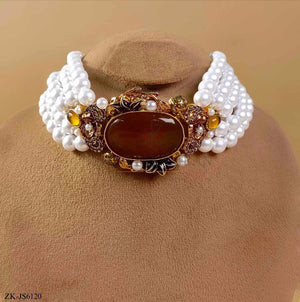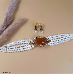 Handcrafted 22k gold plated choker alongside earrings studded with champagne, zircons and pearls.