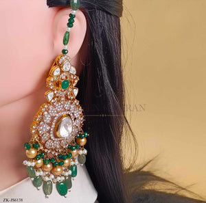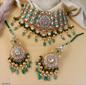 Handcrafted 22k gold plated choker alongside earrings studded with emerald, zircons and golden pearls.