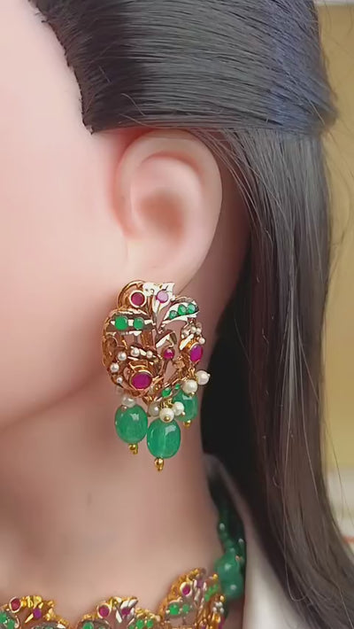 Handcrafted 22k gold plated necklace alongside earrings adorned with emerald and ruby.
