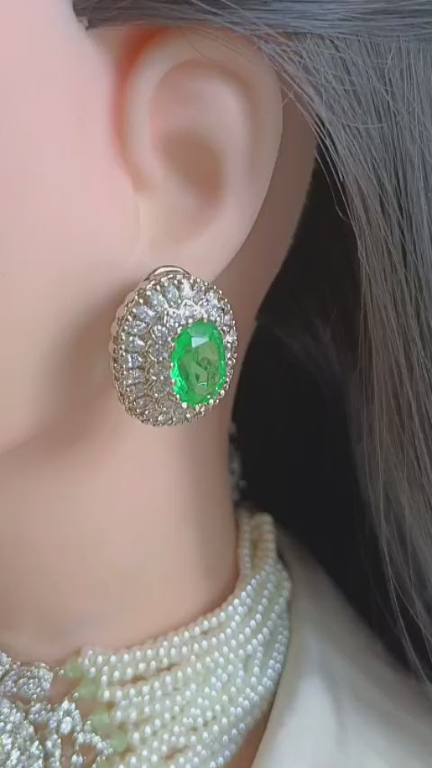 Handcrafted silver plated choker alongside earrings studded with emerald, zircons and pearls.