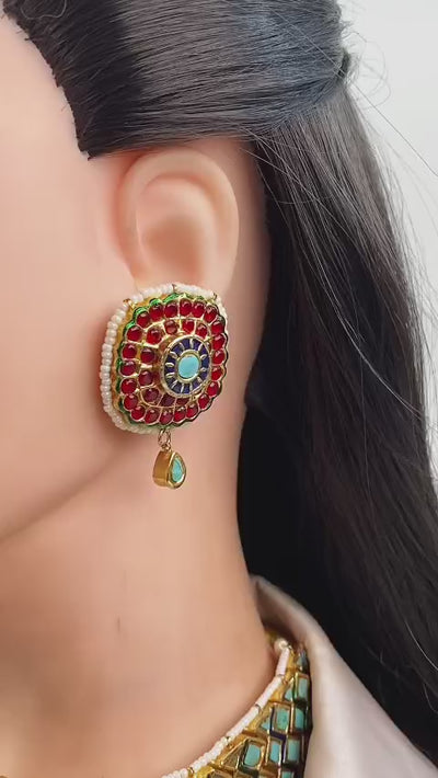 Handcrafted 22k gold plated choker alongside earrings adorned with feroza, garnet and pearls.
