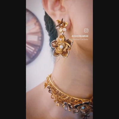 Handcrafted 22 k gold plated floral choker with earrings studded with pearls.