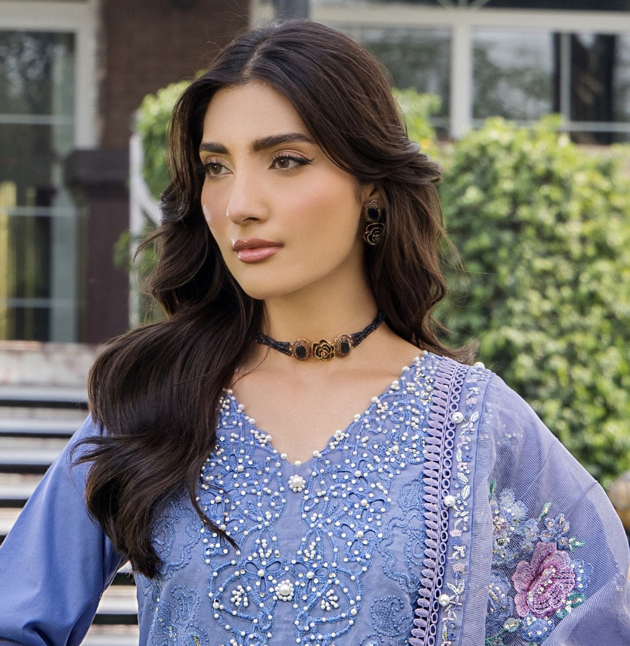 Handcrafted 22k gold plated choker alongside earrings studded with sapphire and coffee stones.