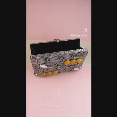 Handcrafted silver plated clutch adorned with emerald, yellow jade and white opals .